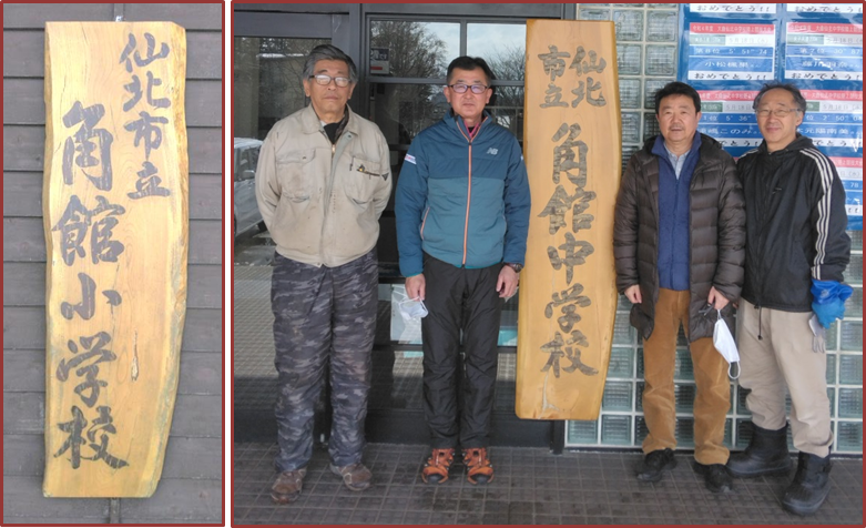◇この度、凌雲会で過去に作製、設置した角館中、角館小の両校校名看板(樺細工仕様)の修繕をして、4日、再設置をしました。母校角館中看板は平成17年(我々45歳、中学校卒業30年経過記念)に掲げてから17年間ほど玄関で風雨・風雪にあたっており、特に校名文字部分の割れや剥がれもある状態でした。念入りの補修により元通りに蘇りました。角館中では三浦校長の立会いを得て「ありがとうございます」と言葉をもらいました。また、角館小の看板は平成20年の統合、新校舎で開校の時にPTA事業とタイアップして作製した品でした。こちらは、樺の傷みは無かったのですが、塗料の劣化により文字の樺が白くくすんでいたところでした。塗料を剥いで新たに塗りを施しました。